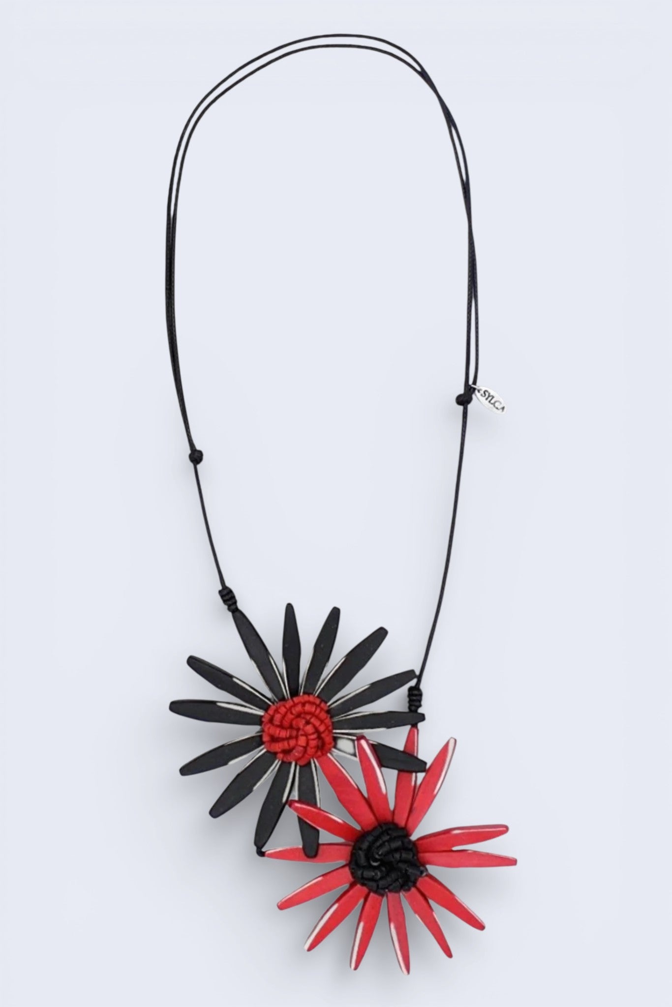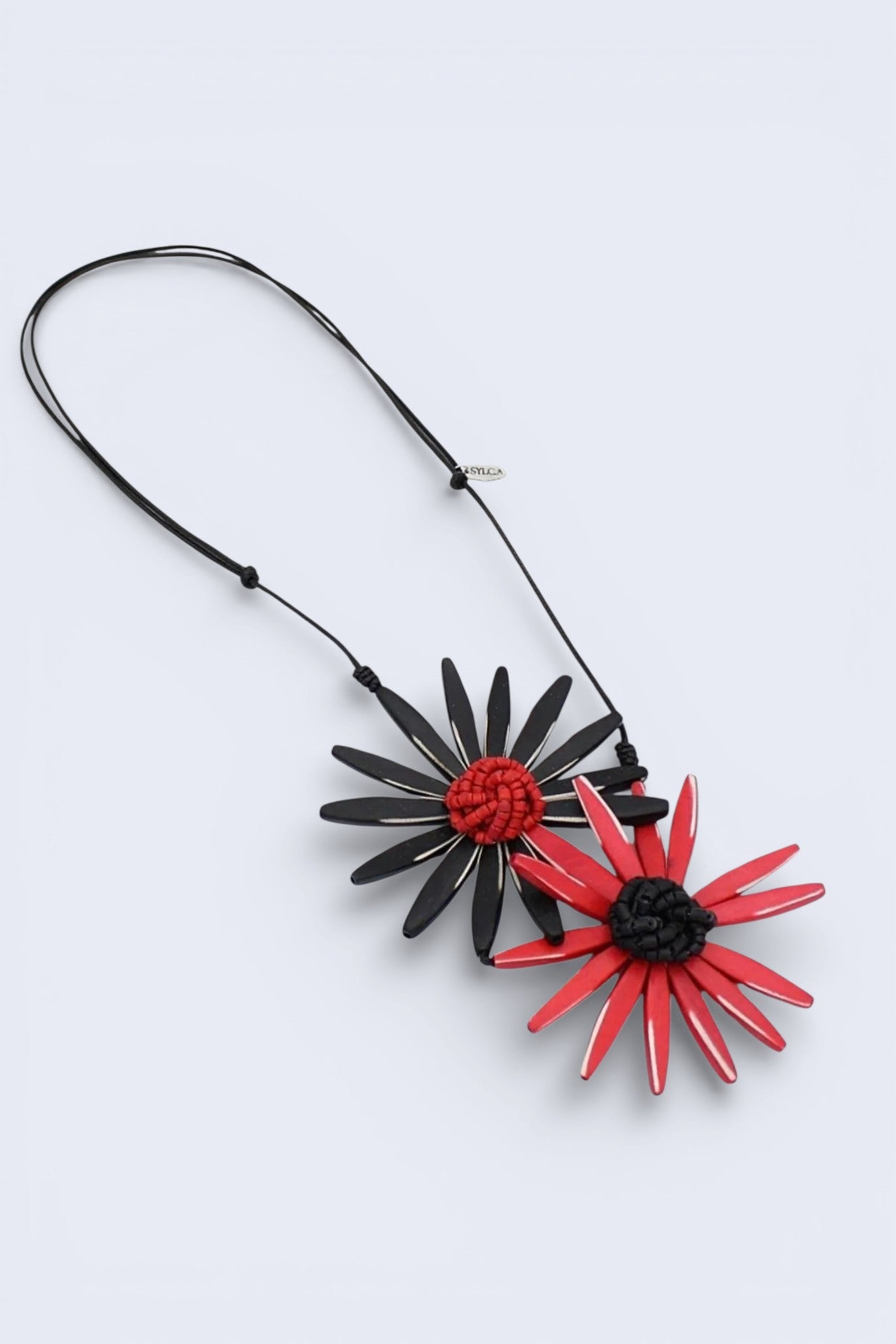 A wearable piece of art; this handmade pendant necklace is one of a kind. Two handcrafted wooden flowers in black and red are carved out and hung on an adjustable black wax cord. The middle of the flower is made up of a cluster of tiny beads that add a 3D effect to the necklace. Wear this necklace over your favorite tee or dress along with the coordinating earrings.